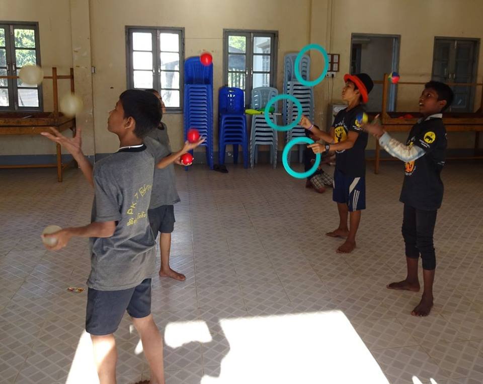 Serious Fun trainer Jules Howarth is teaching 25 boys in the circus team at Thanlyin Boys’ Training Centre, who he describes as the best young jugglers in Burma currently, full of humour and madcap energy. Many are in their second season with Jules and they’ve been working hard on their circus skills. When Jules returned in December, they turned out for the first workshop wearing their T-shirts from last year’s International Juggling Festival, proudly showing off the “everyone needs to have fun” logo and eager to show Jules what they’d been practising.