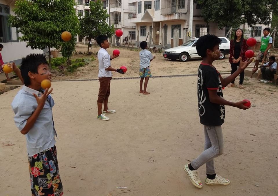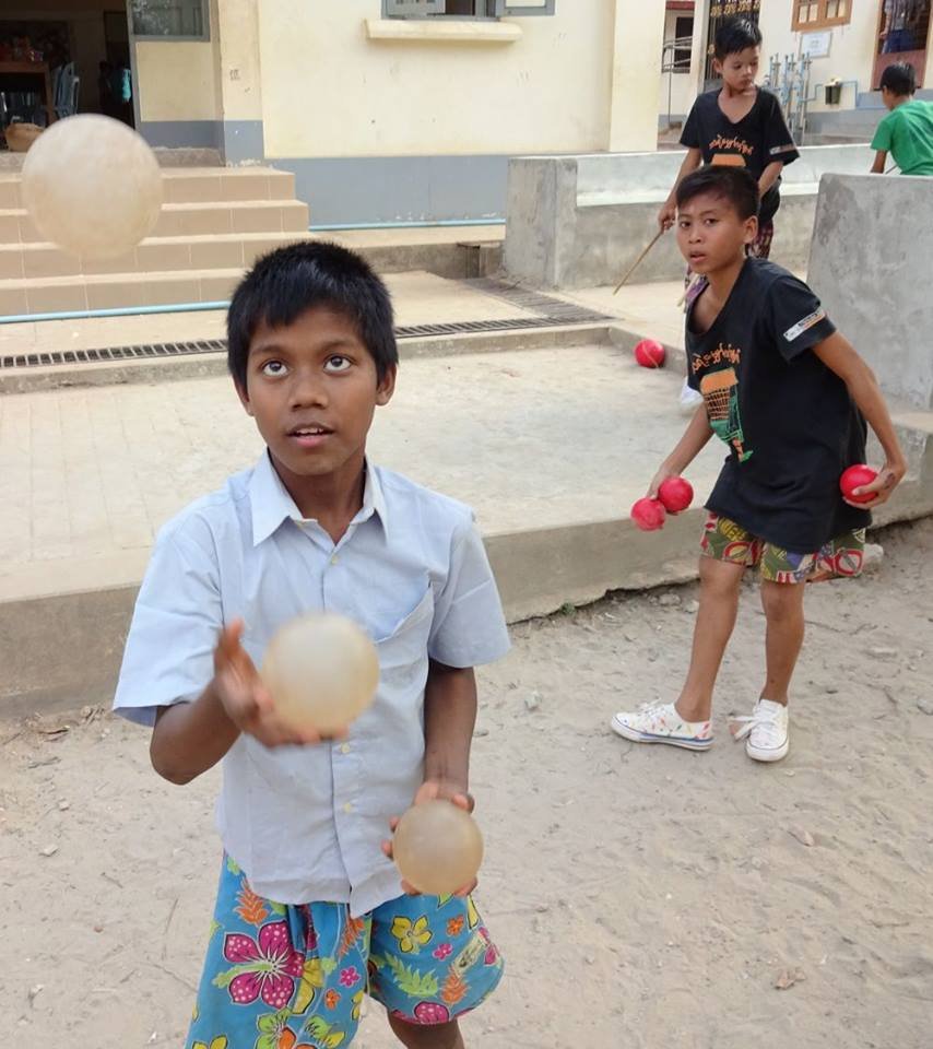The Civil Society Initiative, a volunteer effort of the British Council Library, visits the centre regularly with a mobile library, reading stories and loaning books to the boys. CSI introduced us to the boys and U Kyaw Oo in 2014 and CSI volunteer Zin Zin is providing fine assistance to Jules as the translator for the Thanlyin workshops this season. CSI and the British Council are supporting the Day of Fun on February 13 when we’ll bring all the circus teams in Yangon together for workshops, rehearsals and presentations. We are very grateful for their support and encouragement for the social circus project. We’re really looking forward to seeing what the boys and other circus teams will get up to when they all get together.
